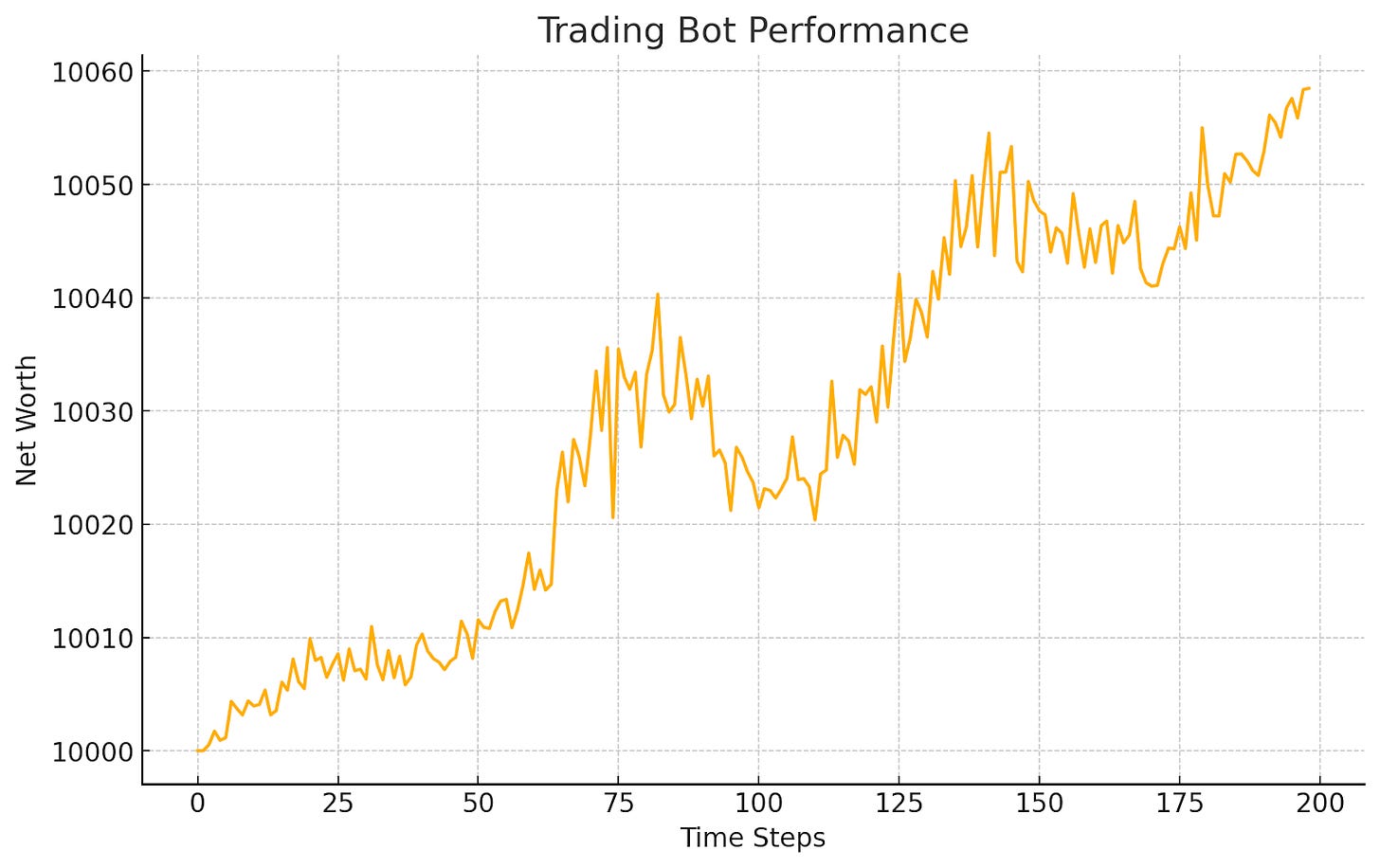 Today, we’ll be using RL strategies to create a trading bot that learns to optimize its stock positions dynamically, using live market data to decide when to buy, sell, or hold shares of Apple. By leveraging the Deep Q-Network algorithm, our bot will interact with a simulated market environment, continuously improving its decision-making over thousands of timesteps. This approach aims to demonstrate how reinforcement learning can be applied to financial trading for maximizing net worth through strategic actions.