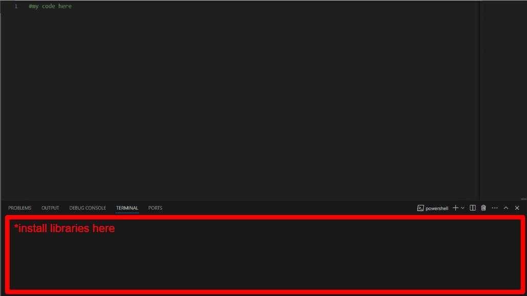 If this is your first time using these libraries on VS code, you’ll need to install them. Unlike our actual code, we ARE NOT going to run this in the shell. Instead, we install libraries by running them in the terminal. In the image below, the terminal is highlighted in red.