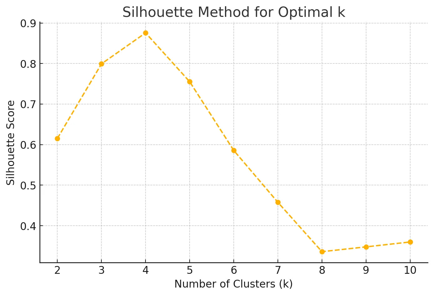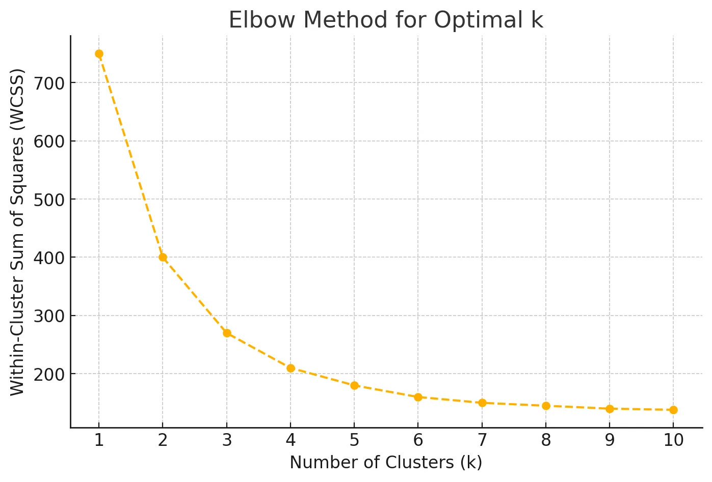 The optimal k is typically chosen at the “elbow point” of the WCSS plot, where the reduction in WCSS slows significantly. This indicates that adding more clusters doesn’t substantially improve clustering quality, as the clusters are already compact.